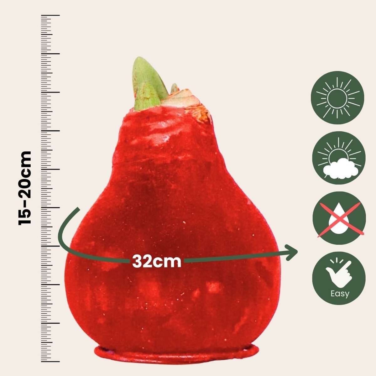 Faites entrer l'atmosphère hivernale dans votre maison avec l'Amaryllis ! Les belles et élégantes fleurs rouges volent la vedette à votre intérieur hivernal. Les magnifiques fleurs ont une période de floraison de 3 à 6 semaines. Le bulbe mesure environ 32 cm de circonférence et est recouvert d'une couche de cire de velours rouge.