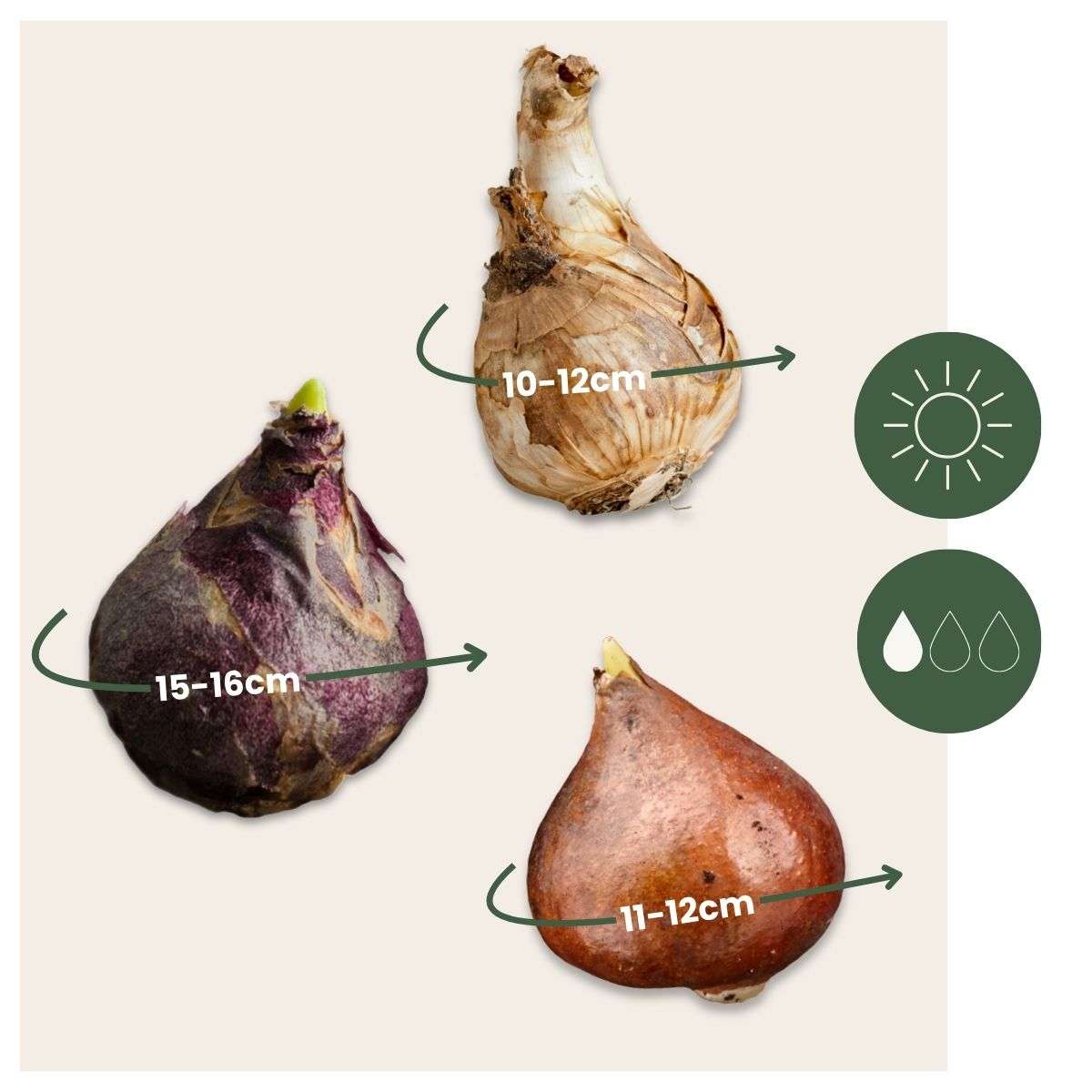 Les bulbes ont une circonférence d'environ 10/12 cm à la livraison.