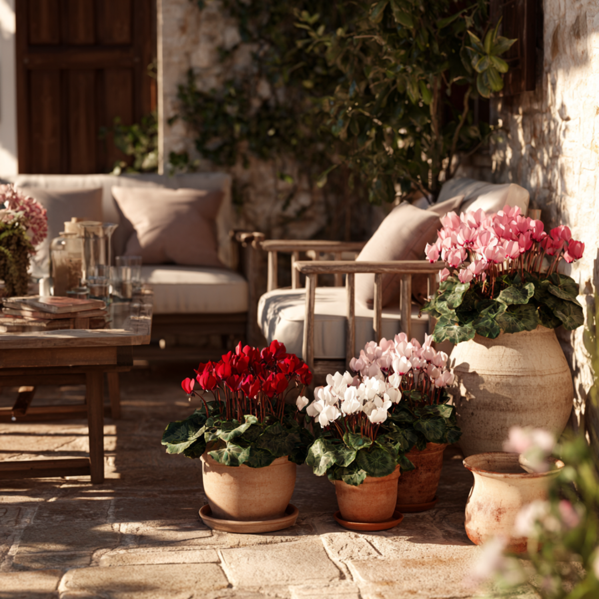 Le cyclamen préfère un endroit lumineux mais frais, à l’abri du soleil direct et des sources de chaleur. La température idéale est d’environ 15 °C. Arrosez régulièrement mais modérément : le sol doit rester légèrement humide sans être détrempé. Évitez de mouiller les feuilles et les fleurs ; versez plutôt l’eau directement sur la terre ou plongez le pot intérieur dans un peu d’eau pendant 30 minutes avant de le laisser bien s’égoutter. En hiver, réduisez la fréquence d’arrosage. Le cyclamen est semi-rustique et doit être protégé du gel.