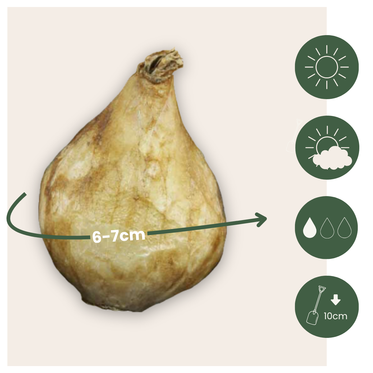 Muscari Armeniacum, également connue sous le nom de 'jacinthe de raisin', est l'une des fleurs de printemps les plus populaires ! Présente en Europe, en Russie et en Asie du Nord, la jacinthe de raisin annonce le début d'une nouvelle saison pour de nombreuses personnes. Les mignonnes petites fleurs bleues fleurissent en avril-mai et égayent instantanément ton jardin. Elles sentent délicieusement bon et, grâce à ce parfum, elles attirent les abeilles et les bourdons. Les bulbes peuvent être plantés entre septembre et novembre, pour que tu puisses profiter d'un jardin coloré au printemps. Ils peuvent aussi être plantés dans des pots, ce qui les rend parfaits pour le balcon aussi. La jacinthe de raisin peut atteindre une hauteur d'environ 15 cm.